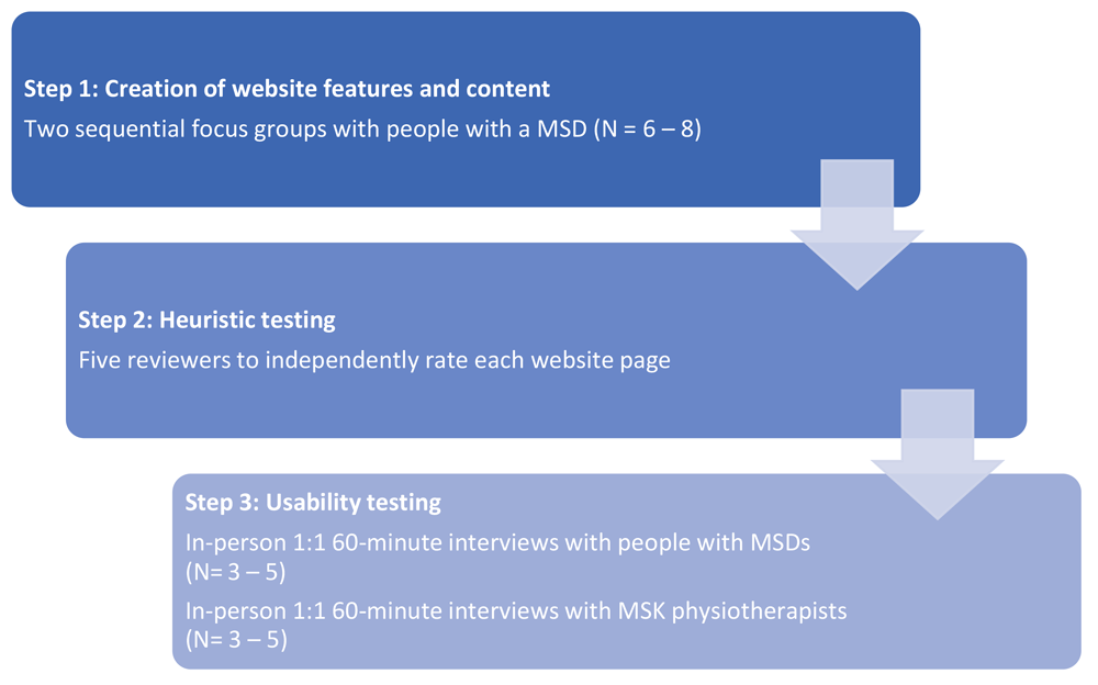 Individuals with a MSD: Purposive sampling, using the same eligibility criteria and recruitment strategy will be used as described in Step 1. Potential participants will be naïve to the development of the eHealth intervention. Given approximately 80% of usability problems can be identified using a sample of three to five users42, we will recruit this number of individuals with a MSD42.