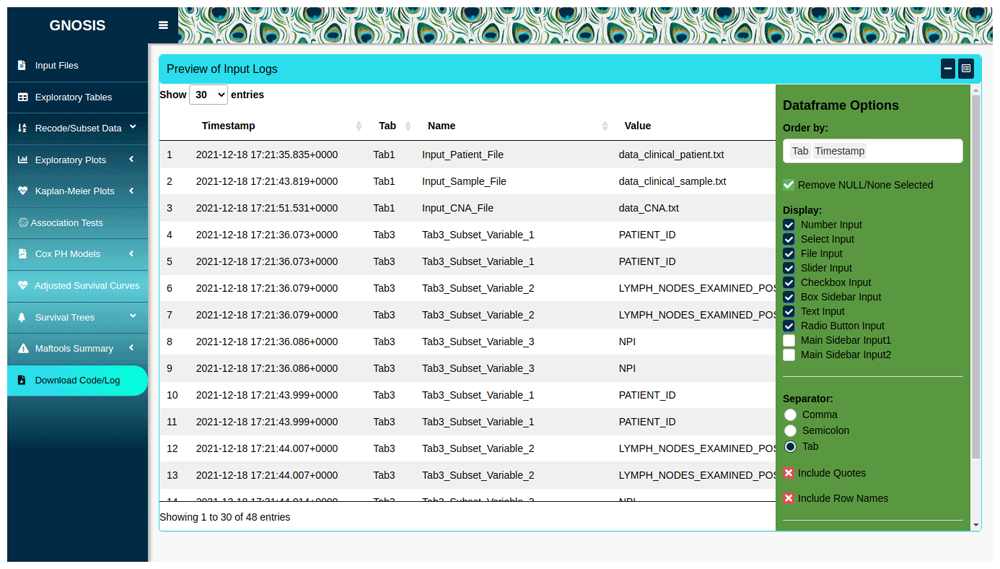 GNOSIS facilitates reproducible research by providing a Download Code/Log tab where users can view and download a log containing information on all the inputs selected throughout the session, as well as downloading an R script containing code to reproduce the outputs displayed in the app (Figure 5).