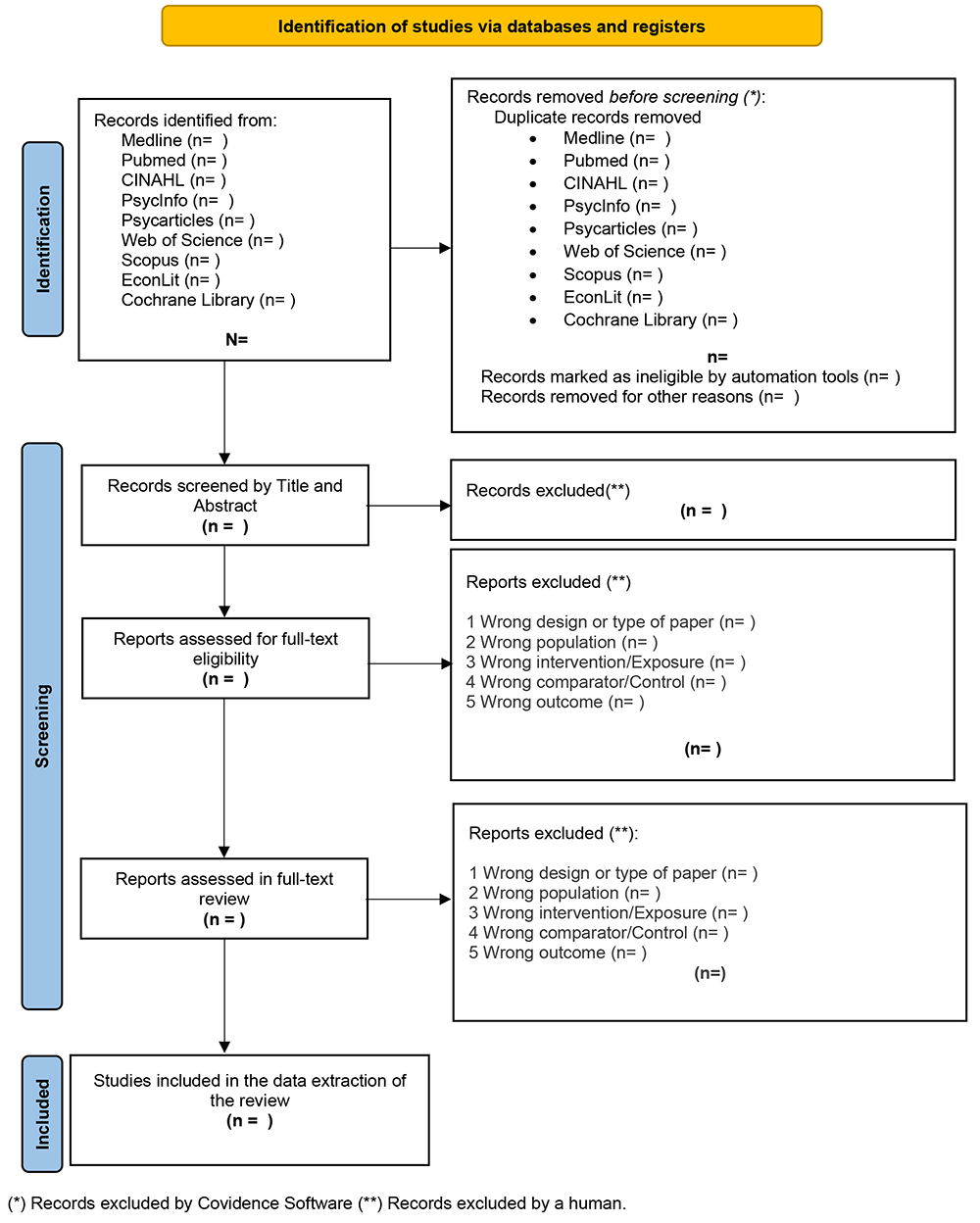 Main databases regarding health and economics published papers will be queried. We will search on: MEDLINE, CINAHL, Scopus, PsycINFO, PsycArticles, EconLit, Web of Science and The Cochrane Library of Systematic Reviews. Only peer review articles, papers and reviews will be included. They must be written in English or in Spanish, otherwise they are excluded.