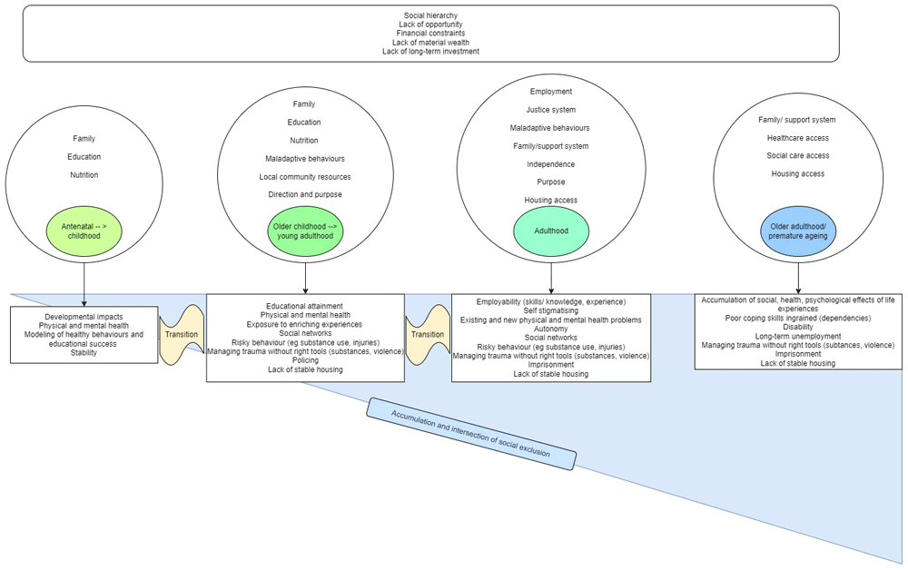 Social exclusion is not a static experience. As mentioned above, it is an intersectional phenomenon where experiences and identities intersect and can amplify each other. Additionally, the expressions and effects of social exclusion accumulate across the life course – a single individual may experience imprisonment, homelessness, and drug dependence across their life course with each potentially compounding the effect of each other deepening social exclusion and causing worse health and life outcomes4,6. Furthermore, social exclusion is associated with exposures and behaviours which can be damaging to health including excessive alcohol use, smoking of substances including heroin and crack cocaine, injecting drug use, rough sleeping, survival sex, and sex work3,5,9–12.