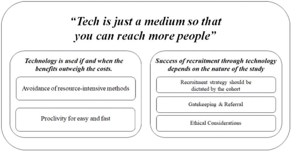 The overarching theme – or message – of the findings was that the use of technology in recruitment is a means of reaching as many people as possible to ensure the sample necessary for the study. If a certain technology could facilitate that and was feasible to utilise, then it would be engaged. This superordinate theme is further explored throughout the analysis regarding the themes and sub-themes.