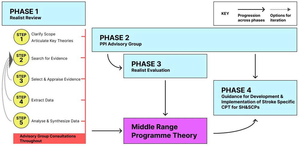 While research into CPT addressing the broad range of stroke acquired communication impairments is evolving, there are limited implementation guidelines and recommendations to direct practice. Aligned with this is the need to address “real world” realities and challenges in implementing complex interventions in complex clinical and educational settings. Realist review adds to existing knowledge and confronts these “real world” challenges by evaluating CPT from a theroetical and explanatory view point. In the development of a middle range programme theory it aims to coherently explain how the intervention is expected to work. While traditional systematic reviews look at what works and effect size, realist review explores generative causation in theory building and asks a much broader range of questions including who does it work for, under what conditions and how? Unlike existing systematic reviews realist review permits the synthesis of relevant and valuable data from diverse sources and methodologies. Including such varied, valuable data in the production of a middle range theory may provide educators with new and essential theoretical and practical guidance in the development and implementation of CPT programmes, tailored to their desired outcomes for a range of SH&SCPs. The middle range theory developed during this review process will undergo further analysis and development in a subsequesnt realist evaluation.