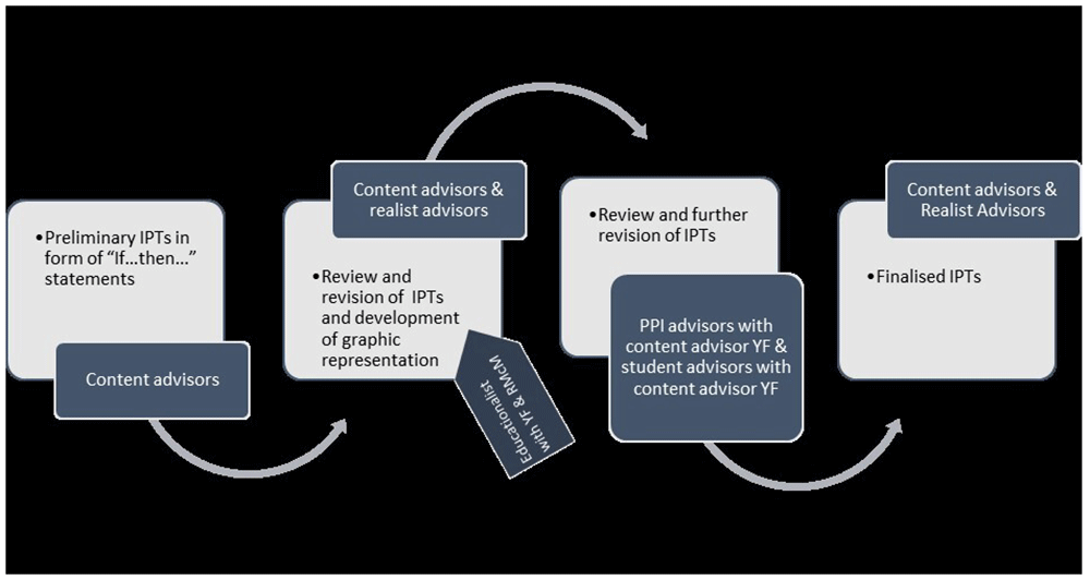 Concurrent with question refinement was initial programme theory (IPT) development. This is a fundamental, early step in a realist review (Pawson et al., 2004; Wong, 2018). Our IPTs set out how CPT for SH&SCPs is thought to work. They will be subject to testing and refinement in the subsequent synthesis process of this review. Figure 2 overviews the IPTs development process.