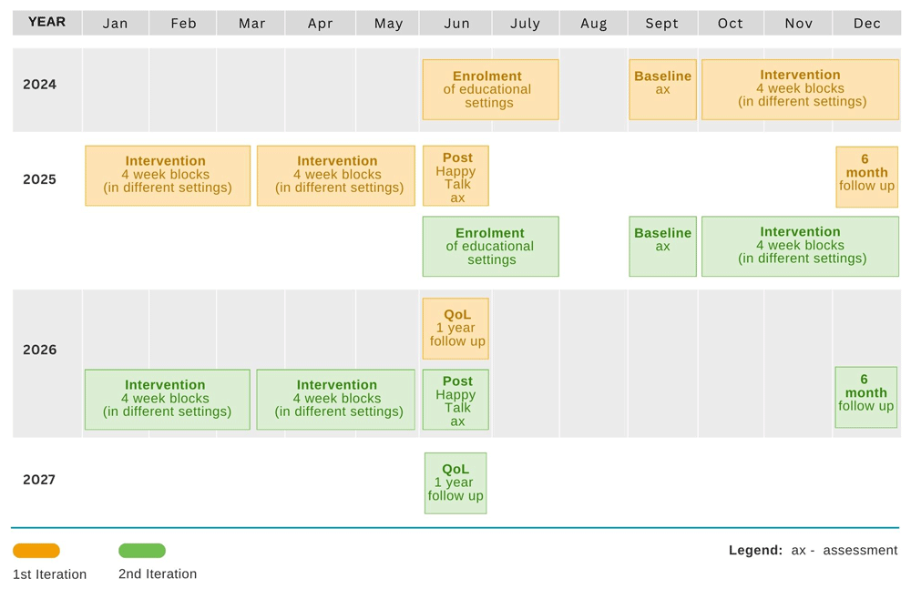 The intervention will be evaluated using a cluster-randomized controlled trial taking place over three years. The trial will include two study cycles that each include a period for enrolling settings, baseline assessments, an 8 month intervention period, outcome assessments immediately post-intervention, and additional follow-up measures taken 6 months post-intervention, or 1 year post-intervention for QoL measures. The time schedule for enrolment, intervention delivery and assessments is given in Figure 1. The process evaluation will involve two phases 1) a pre-trial evaluation examining factors which promote parental engagement and partnership between SLTs and educators with the aim of incorporating these into SLT training and future rollouts of the programme and 2) a concurrent evaluation from a realist perspective to examine how the mechanisms underpinning Happy Talk are influenced by the implementation context. A combination of surveys, interviews and focus group methodologies will be used. These will be reported on in more detail elsewhere.