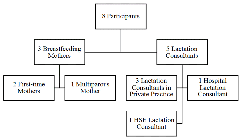 Participants were selected from target populations of breastfeeding mothers and lactation consultants. Purposively selecting a sample from a target population is appropriate as the data collection, processing and analysis are cost and time efficient (Daniel, 2015). Sampling is a low-cost method that allows the researcher to collect the necessary data within the time constraints of the project. Purposive sampling was used to select participants who had first-hand experience of breastfeeding support who were able to provide rich and valuable data relevant to the topic being explored. A small sample size of eight participants (Figure 1) was used as this was large enough to generate original and high quality, rich data but also small enough to get an in-depth analysis (Vasileiou et al., 2018).