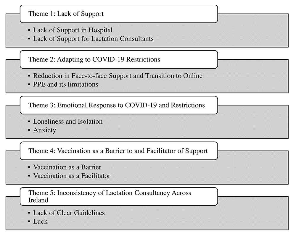 Five key themes were identified: ‘Lack of Support’, ‘Adapting to COVID-19 Restrictions’, Emotional Response to COVID-19 and Restrictions’, Vaccination as a Barrier to and Facilitator of Support’ and Inconsistency of Lactation Support Across Ireland’. Both lactation consultants and mothers identified similar issues however, slight variations within lactation consultants' perceptions of mothers’ and mothers’ attitudes towards online services were seen. An unanticipated finding was the lack of support in hospitals pre-COVID-19.