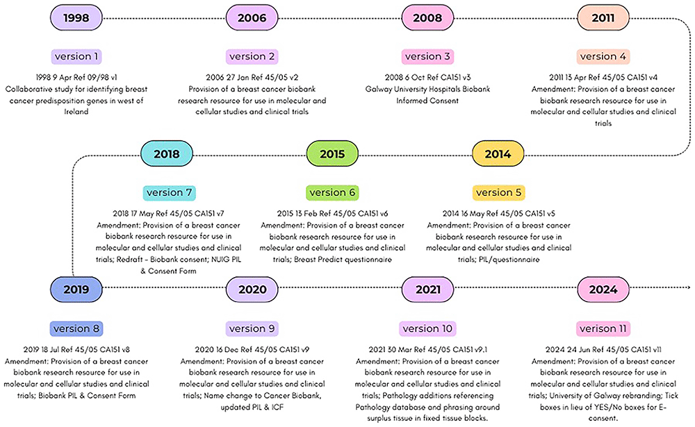 The Cancer Biobank, University of Galway operates under the joint data controllership of University of Galway and the HSE (Health Service Executive) West and North West healthcare region. Over the years and in line with practice guidance, the processes of obtaining informed participant consent have evolved according to changes in study requirements and developments in specimen processing and storage as outlined in Figure 1.