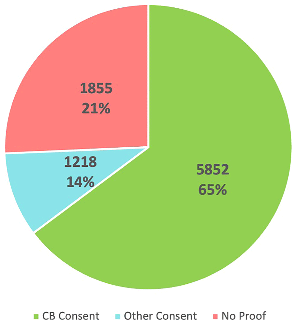 The task of verifying consent documentation for 8,925 participants recruited to the Cancer Biobank between 1998 and 2025 required detailed manual checking, recording, and scanning of all paper and electronic consent forms. Among these participants, 65% had signed Cancer Biobank consent forms, 14% had other types of study-specific consent forms and 21% had no proof of consent on file.