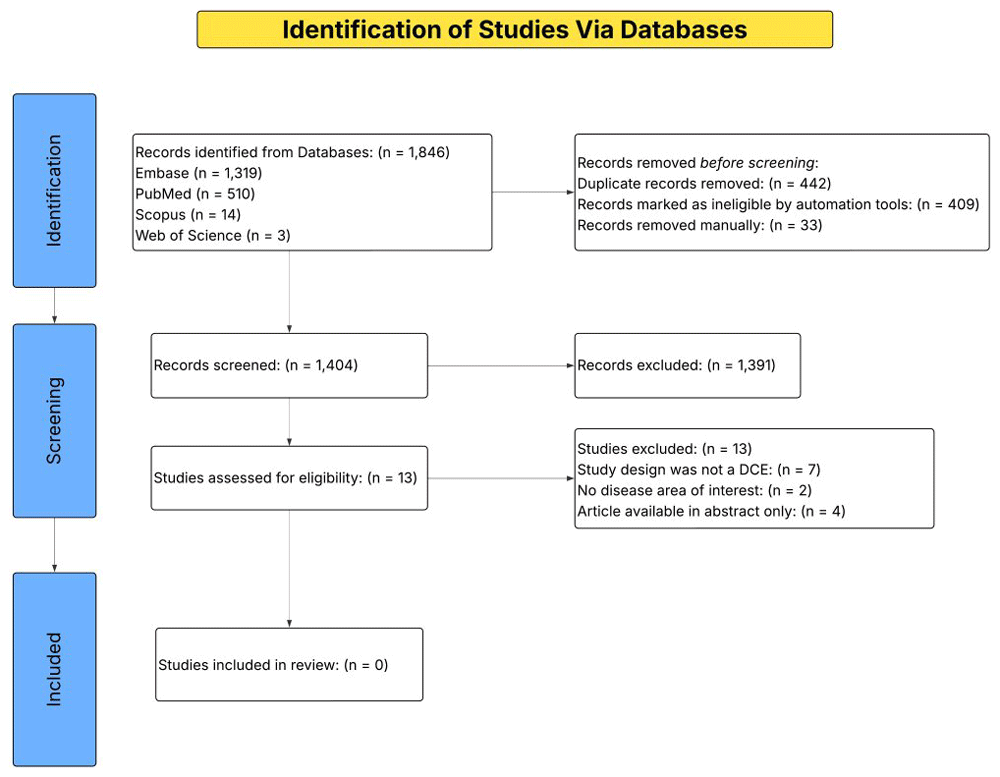 The search strategy yielded a total of 1,846 records. Among them, 1,319 were from Embase, 510 from PubMed, 14 from Scopus, and 3 were from Web of Science. 442 records were identified as duplicates, of which 409 were automatically identified, and 33 were manually identified. After removing duplicates, 1,404 records were put forward to title and abstract screening, from which 1,391 were excluded. The remaining 13 studies were assessed for eligibility in a full-text review. Seven studies were excluded because they did not have a DCE study design. Two studies were excluded because they were not focused on stroke, and the remaining four studies were excluded because they were abstracts only. No studies met the inclusion criteria of this review; therefore, none were included in the review. The results of the search and study selection process are presented in a PRISMA flowchart (Figure 1).