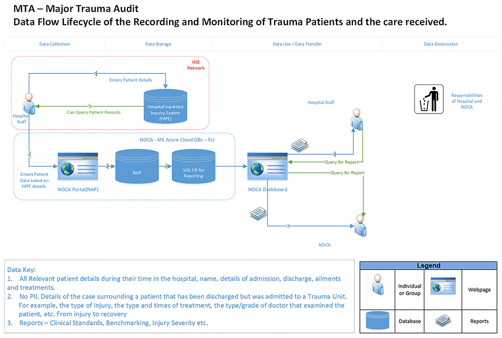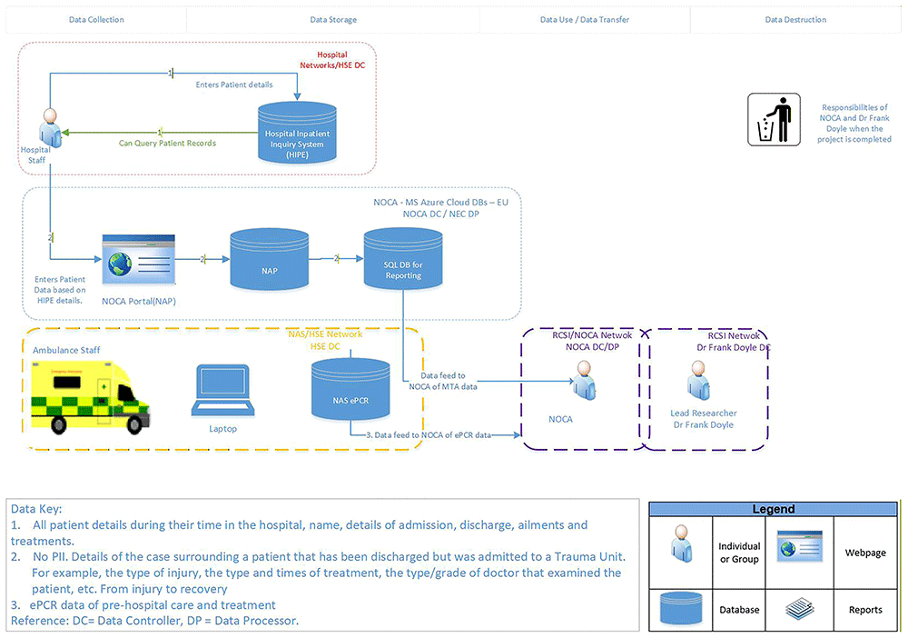 The Targeted Review and Amalgamation of Unmapped Major trauma and Ambulance data in Ireland (TRAUMA) study (https://traumastudy.eu/), funded by the Health Research Board under a Secondary Data Analysis Programme grant, aimed to inform nationally-important policy and practice for trauma care by combining and analysing these two currently-separated datasets (Figure 1 provides an overview of the Data Flow Lifecycle for the TRAUMA study). By combining datasets, a fuller picture of each patient journey can be understood, providing vital information for the ongoing development of the national Trauma System (see Figure 2 for an illustration). Ultimately, this project aimed to provide appropriate data to inform decision making to ensure patients are getting the right care, at the right time, by the right people. There are a number of related objectives ongoing, including the exploration and validation of a pre-hospital trauma triage tool, exploration of geospatial attributes in relation to major trauma incidents and comprehensive mapping of patient profiles and the patient journey.