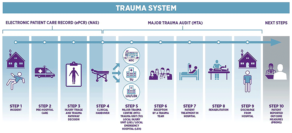 Trauma care is complex and challenging and requires many critical decisions to be made during the early phases of care. It usually requires multi-specialty and often multi-agency responses that necessitates synergy and integration to ensure the best outcomes for patients (Trauma Steering Group, 2018). Traumatic injury is categorised using the Injury Severity Score (ISS) as low, moderate or severe, from simple wrist and ankle fractures dealt with in local injury units and local emergency hospitals, to major trauma, which can result in life-threatening and life changing injuries. Major trauma is better managed in a dedicated Trauma Unit, or preferably Major Trauma Centres for the most severely injured. In the case of major trauma, a national clinical audit was commissioned by the Health Services Executive (HSE) and established in 2013 in Ireland through the National Office of Clinical Audit (NOCA), entitled the Major Trauma Audit (MTA), has gathered data on approximately 5,000 patients annually who suffer major trauma injuries. The audit uses an internationally accredited methodology (National Major Trauma Registry [NMTR], formerly the Trauma Audit Research Network; https://www.england.nhs.uk/outcomes-and-registries-programme/nmtr/). The outputs from this data have been used to help determine the needs of the trauma system. By highlighting the preventable nature of trauma such as road safety, workplace safety, tackling violence, reducing self-harm and preventing falls, the audit has been a key driver for change within the healthcare system (Trauma Steering Group, 2018).