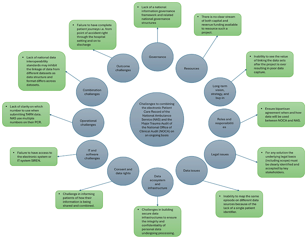 A) Identify challenges to combining the electronic Patient Care Record of the NAS and the Major Trauma Audit of NOCA on an ongoing basis for the interdependent purposes of clinical decision making, service quality improvement, and research.