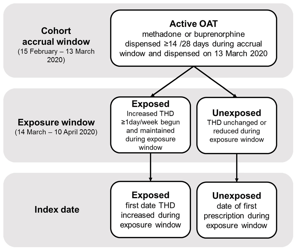 Exposure: increase in OAT take-home doses. Individual baseline take-home dosing regimen will be defined as the highest weekly number of take-home doses observed during the accrual window. The exposure window will be defined as the 4 weeks following the guidance change (March 14th, 2020, to April 10th, 2020). We will calculate the number of take-home doses on each OAT prescription during the exposure window. Using these data we will classify individuals as exposed if they experience an increase in their weekly take-home dosing by at least ≥1 day(s) during the exposure window compared to their baseline regimen. The index date will be defined as the first date of an increase in take-home dose level and to be considered exposed, this increase must be maintained or surpassed for the rest of the exposure window. Individuals whose take-home dose regimen did not meet this criteria will be classified as unexposed. The index date for the unexposed group will be defined as the date of the first prescription during the exposure window. All unexposed individuals will be required to be actively treated with methadone or buprenorphine on this assigned index date and until the end of the exposure period to ensure comparability between groups. Figure 1 displays the definition of the study cohort and exposure groups.