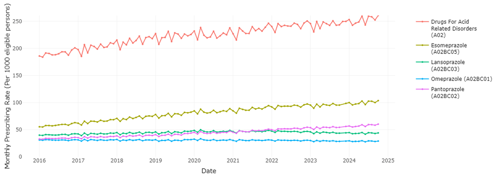 This application can be used to visualise the different medications within a therapeutic class, and evaluate trends in use of the HSE preferred drugs over time relative to other agents within the class. Users have the ability to choose various medications from a therapeutic group in order to observe the prescribing trend for each medication and the overall therapeutic group. Examining PPIs as one of the most commonly prescribed therapeutic classes, Figure 1 shows that esomeprazole is the most frequently prescribed PPI, ranging from 55.38 to 103.61 prescription dispensings per 1,000 eligible persons per month, with an increasing trend over time. Pantoprazole, the HSE preferred drug, was the third most frequently dispensed PPI at the start of the period of data coverage (a prescription rate of 32.82 per 1,000 in January 2016), however the rate of prescribing has increased and surpassed lansoprazole since 2021 to reach 60. 26 per 1,000 in October 2024. Esomeprazole is increasing as a proportion of prescribing within drugs for acid-related disorders (from 0.298 in January 2016 to 0.397 in October 2024, Figure 2), while pantoprazole (Figure 3) increased from 0.177 to 0.231. This indicates improved alignment with the preferred drug initiative recommendation for PPIs, but significant potential for further improvement.