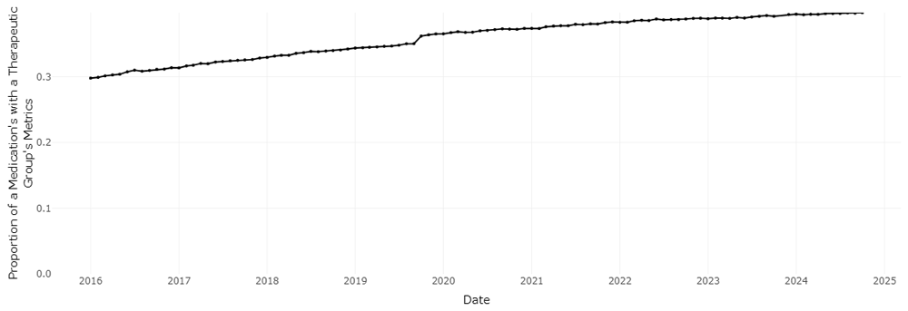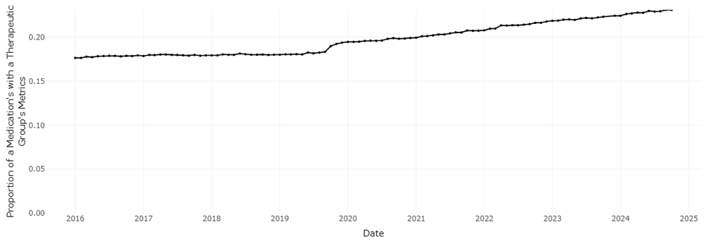 The RxTrends application's capabilities were extended by allowing users to select an unlimited number of entities across multiple categories, including medications, therapeutic groups, and physiological systems. The "Compare Selected" button in the application enables users to compare frequencies, costs, or rates over time when two distinct entities are selected. This feature allows the application's server-side logic to compute for the selected metric (e.g. prescribing frequency, cost of the medication/therapeutic group) the proportion of higher-level entity in the WHO ATC classification hierarchy (i.e. therapeutic group or physiological system) made up of the lower-level entity (i.e. medication or therapeutic group). These comparisons are dynamically visualised in the interactive plots powered by ggplot2 and plotly.