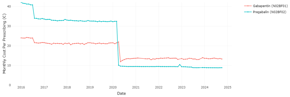 In December 2019, the HPRA published an updated list that included interchangeable pregabalin and gabapentin medications for the first time18. The HSE than set reference prices effective from 1st April 2020 for the groups of interchangeable pregabalin products19, and from 1st May 2020 for gabapentin products20, in both cases representing a substantial price reduction compared to the previous prices. Figure 4 illustrates the impact of allowing interchangeability between brands and then reference pricing for gabapentinoids. Following these changes, the ingredient cost per dispensing of prescribed pregabalin and gabapentin experienced a considerable decrease. Specifically, the cost for pregabalin dropped from €32.49 per prescription in March 2020 to €10.14 per prescription in April 2020, and the cost for gabapentin dropped from €21.98 per prescription in April 2020 to €11.95 per prescription in May 2020 (Figure 4).