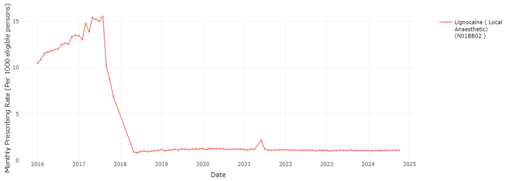 The HSE PCRS pharmacy claims data for Ireland was accessed via the PCRS’s Reporting and Open Data platform (available at https://www.sspcrs.ie/portal/annual-reporting/). We used their reports of monthly figures for the top 100 prescribed medications, ordered by their prescribing frequency or ingredient cost, as well as equivalent figures for total prescribing by therapeutic group, for the GMS scheme. We also used their reports on monthly numbers of eligible people for the GMS scheme. The current RxTrends application uses monthly prescribing data from January 2016 to October 2024 for the subset of the population who were eligible for the GMS scheme. GMS scheme data captures dispensing information for all reimbursed items for all eligible persons. We used only this drug scheme, as for the Drugs Payment Scheme, data for any month only includes dispensings where household prescription medication expenditure exceeds a certain threshold. Additionally, Long Term Illness scheme data includes only medications that are related to specified health conditions, and only overall scheme eligibility is reported rather than by individual condition.
