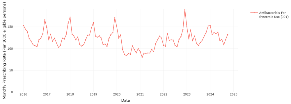 The RxTrends application provides a graphical analysis of prescription trends, presenting monthly data over the course of years, which allows potential seasonality in medication use to be evaluated. Figure 6 and Figure 7 clearly show a considerable increase in prescription rates of antibacterials for systemic use and drugs for chronic obstructive lung disease over the winter months, reaching a peak between December and January of each year. This spike is likely associated with the greater occurrence of infections and respiratory diseases during the colder months (as a possible trigger), requiring higher usage of these medications. The sharp seasonal peaks are less pronounced or absent for the winters of 2020/2021 and 2021/2022, likely due to social distancing and other measures to reduce transmission of COVID-19 during the initial phases of the pandemic23. These measures also reduced circulation of other respiratory infections23.