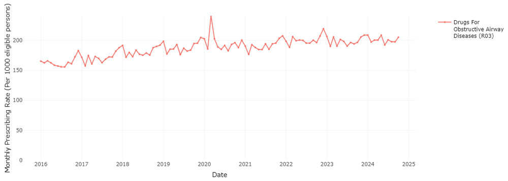 Similar to data from OpenPrescribing in England, the current application shows a spike in the prescription rate of drugs for chronic obstructive airway diseases (R03) in March-April 2020, coinciding with the onset of the COVID-19 pandemic in Ireland24. This may be attributed to increased patient stockpiling, and improved adherence to inhalers during the initial months of the pandemic due to public health messaging that people with respiratory conditions may be at high risk of complications of COVID-1924.
