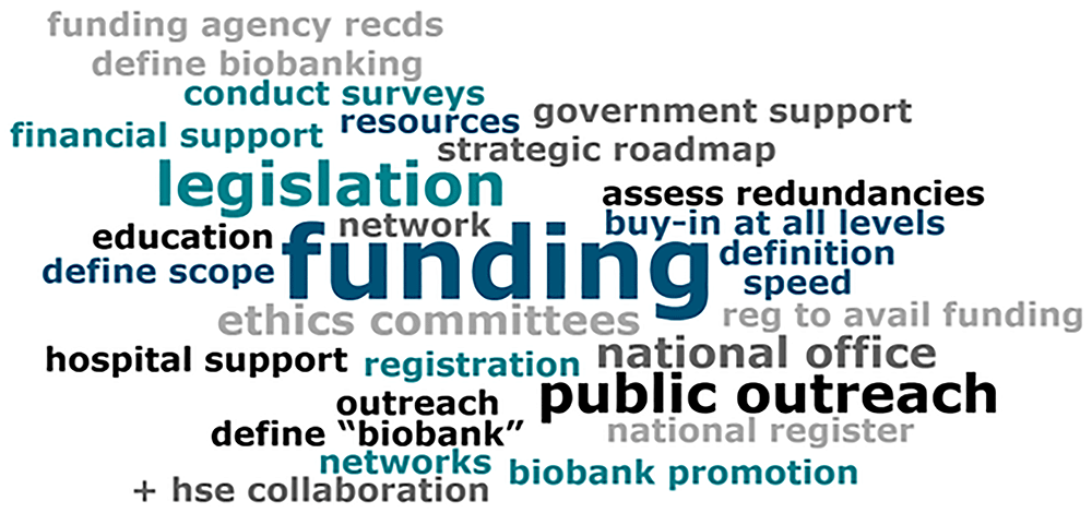 Questions for the panel were prepared by the BioBANC na Gaillimhe organising committee ahead of the symposium, to guide discussions towards achieving strategic goals. During the discussion, VEVOX live polling was used to gauge audience views and questions on posed topics, enabling interactive audience participation and capturing real-time feedback to enrich the discussion. Responses to the question "What steps can be taken to better map the Irish Biobanking landscape?" were visually summarised in a word cloud (Figure 2), highlighting key themes such as legislation, funding, and public outreach as important in shaping the future of Irish biobanking.