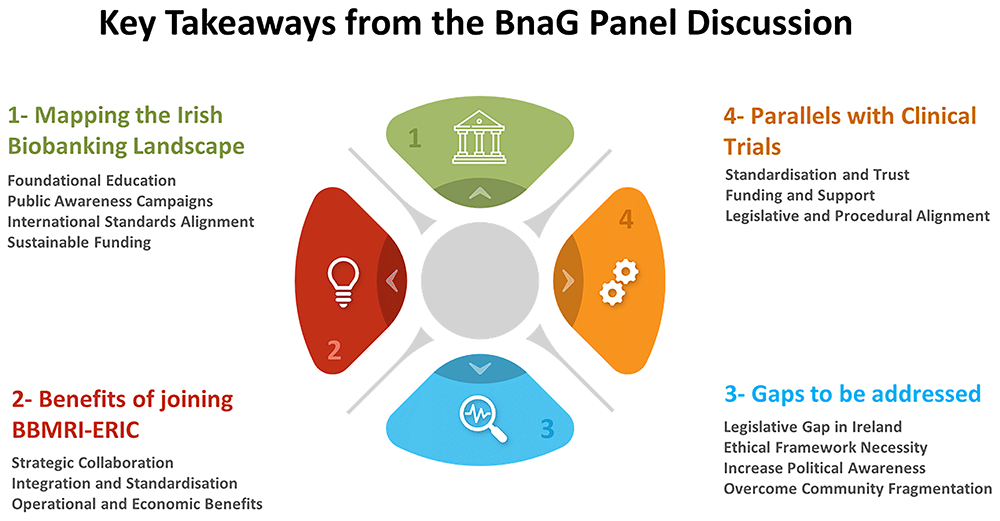 The panel emphasised the need for a strategic approach to overcome legislative and procedural challenges in Irish biobanking. Aligning with European standards and pursuing BBMRI-ERIC membership were discussed as key steps. These measures would enhance research capabilities and enable more effective, personalised healthcare solutions.