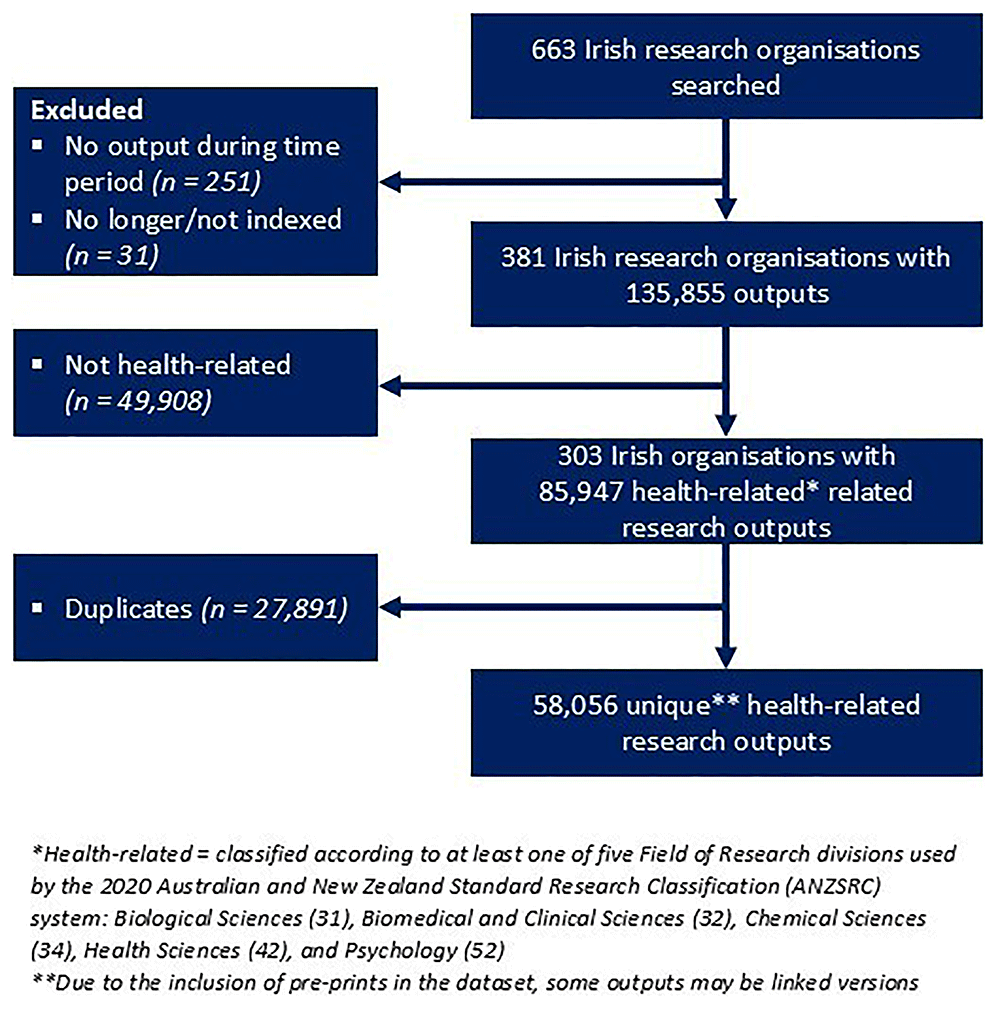 Of the listed 663 Irish research organisations, 381 (Appendix 2) had 135,855 research outputs within our time period with 100,016 being unique. After filtering and deduplicating research outputs to only include those which belonged to at least one of our included areas of health research24, there were 58,056 unique-health related research outputs associated with 303 research organisations (Figure 1).