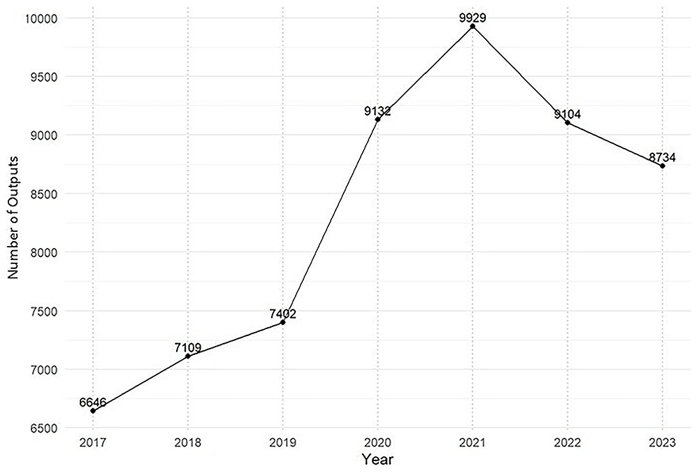 To investigate trends, we plotted the overall number of outputs, subjects, subdivision areas, sectors, and publishers on a yearly basis. When attempting to plot data on a daily and quarterly basis, we discovered indexing errors where 1 January of every year was overrepresented in the dataset. After contacting Altmetric support, we were notified that when a publication does not include a complete publication date, the Altmetric system automatically fills in the missing information with ‘01’, creating January 1st if both the month and day are not specified. We also tried to address date issues by pulling publication dates from OpenAlex API but there were more incorrectly indexed items (e.g., showing years prior to 2017). For this reason, we deviated from our protocol and chose not to conduct any analyses as daily or quarterly. We also did not use the yearly OpenAlex prespecified topics and concepts due to resource constraints although the data is available on the Open Science Framework25.