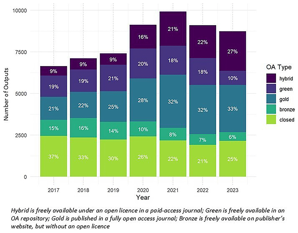 There was an increase in the number of outputs from 2017 to 2020 with a steep incline from 2019 to 2020 (23%), and an increasing trend continuing into 2021 (8.7%). After 2021, the number of outputs declined but it has not returned to pre-pandemic (2019) levels. (Figure 2) An overwhelming majority of research outputs were articles (96.6%), with much less being chapters (3.34%) or books (<1%). A majority of outputs were available as open access (73.2%) with general increases over time, although rates in 2021 (78%) and 2022 (79%) were higher than 2023 (76%) (Figure 3). Closed access has decreased over time although it still represents roughly 1 in 5 outputs in the dataset. Open access (OA) can be classified by Altmetric35 in several ways: 1) hybrid is freely available under an open licence in a paid-access journal, 2) green is freely available in an OA repository, 3) gold is published in a fully open access journal, 4) bronze is freely available on publisher’s website, but without an open licence. Hybrid and gold access have increased over time while green open access has remained relatively stable and bronze has decreased over time.