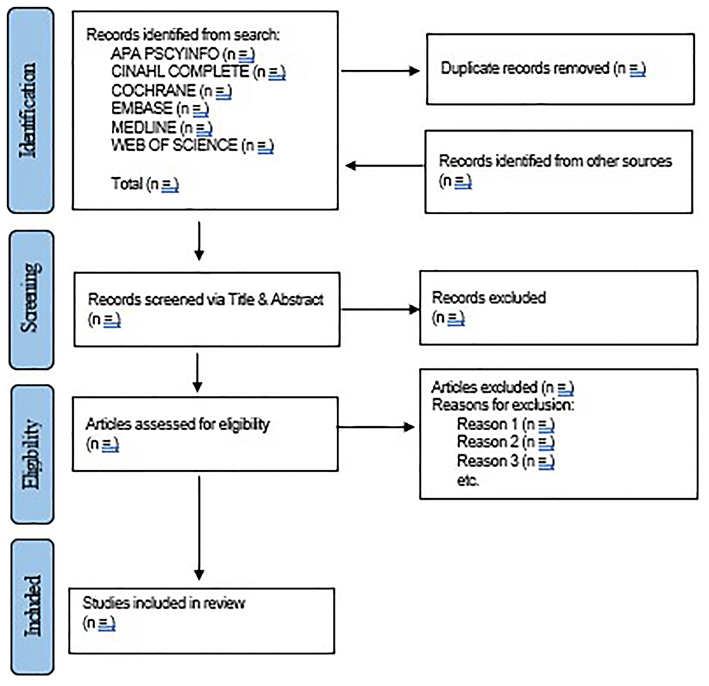 The literature for this study will be stored and managed using the referencing software Endnote 21 (Version 21.2, Clarivate analytics, Australia). The Preferred Reporting Items for Systematic Reviews and Meta-analysis (PRISMA) guidelines will be used when identifying and selecting articles for review within this study and will be in compliance with the flow chart below. See Figure 1. Articles will be imported to Endnote following the initial search and any duplicates removed. The remaining articles will be screened and reviewed using Covidence software (Covidence, Veritas Healthy Innovation, Melbourne, Australia) for their titles and abstracts by two independent reviewers (PH, CT) and any discrepancies which may arise will be resolved following discussion among authors. Furthermore, the remaining full-text articles will be retrieved and screened for eligibility using the eligibility criteria pre-determined in Covidence. The full-text articles will be divided amongst the team into two teams of two reviewers and a verifier in each team (PH and Reviewer 2, Reviewer 3 and Reviewer 4). Any additional articles using an extended search through additional databases; or through citation tracking will also be included and screened for eligibility using the above process. To assess the articles for risk of bias, the Mixed-Methods Appraisal Tool (MMAT-version 2018) (Hong et al., 2018) will be used to address the qualitative, quantitative and mixed-methods studies for inclusion in this review and any discrepancies between authors will be solved using an additional verifier.to cross-check any inconsistencies and to reach a conclusion on study selection.